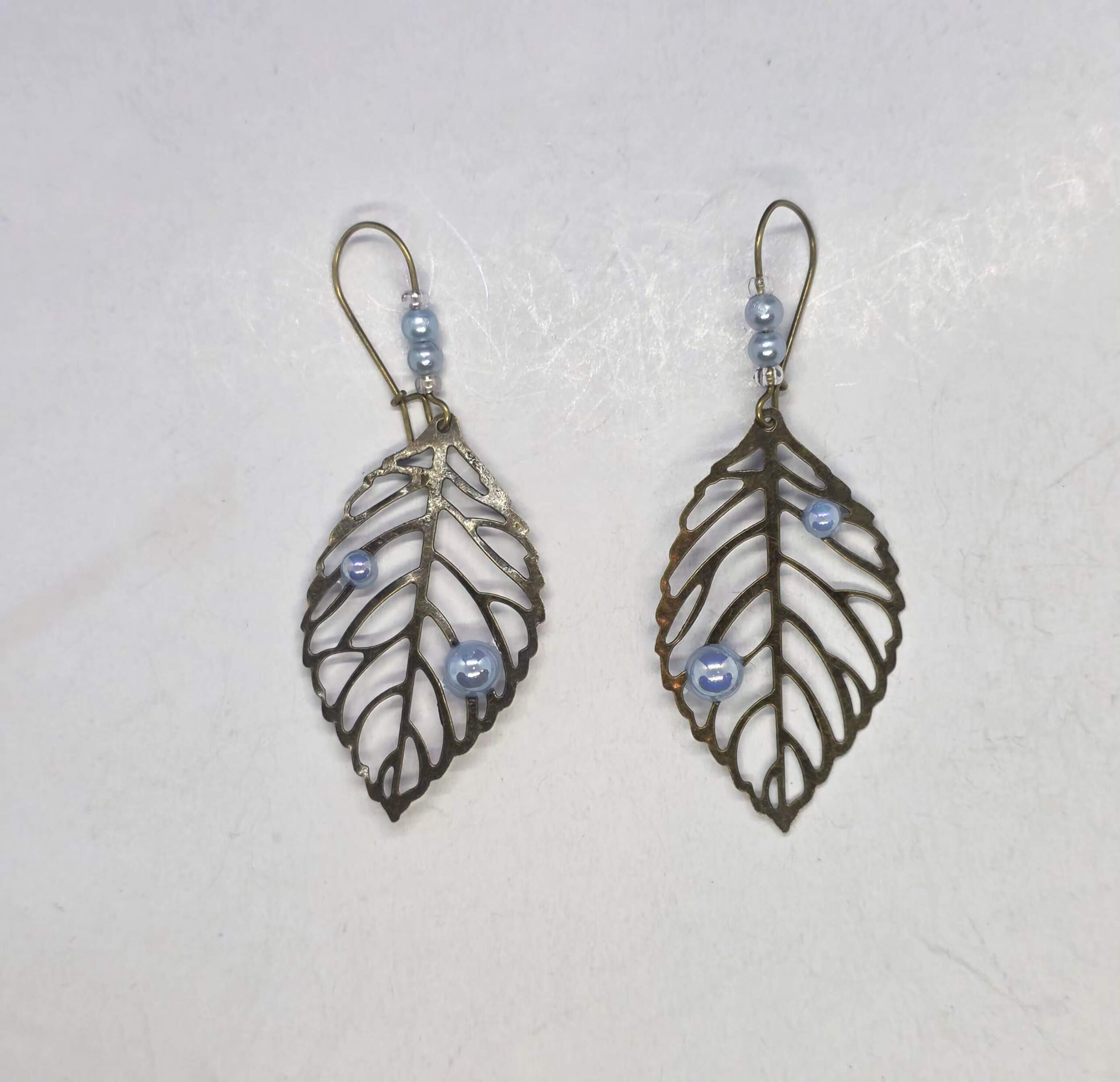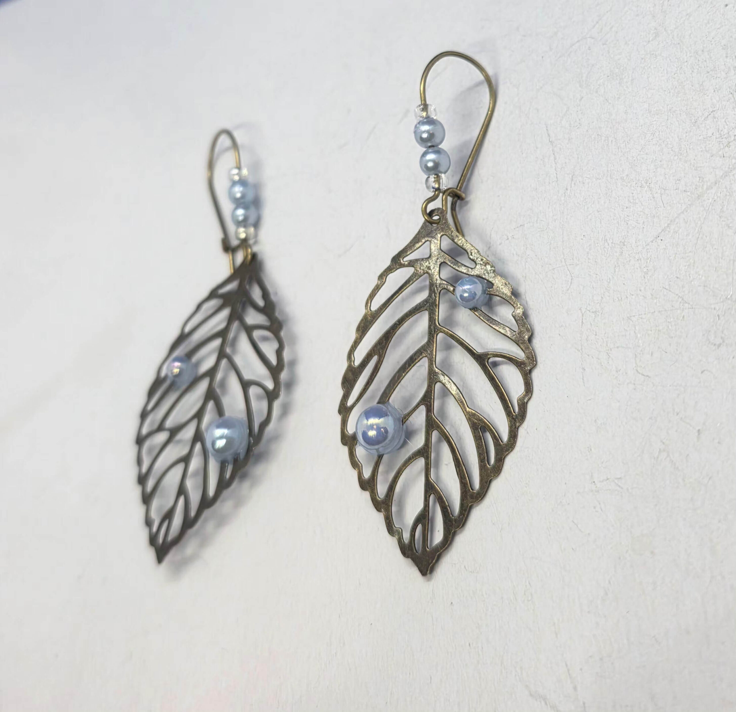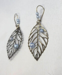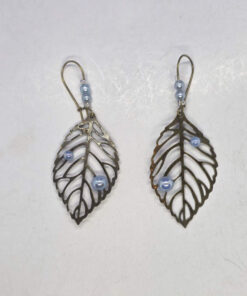 Aqua pearls bronze leaf drop earrings