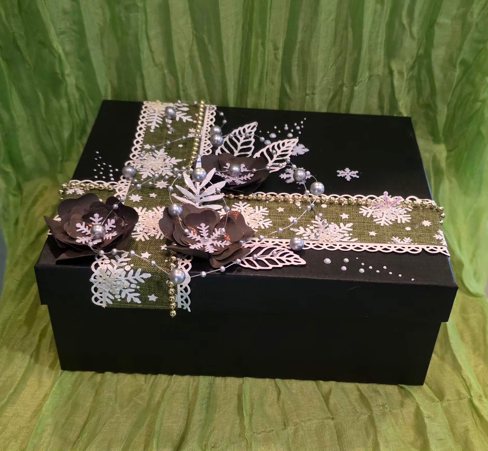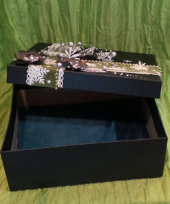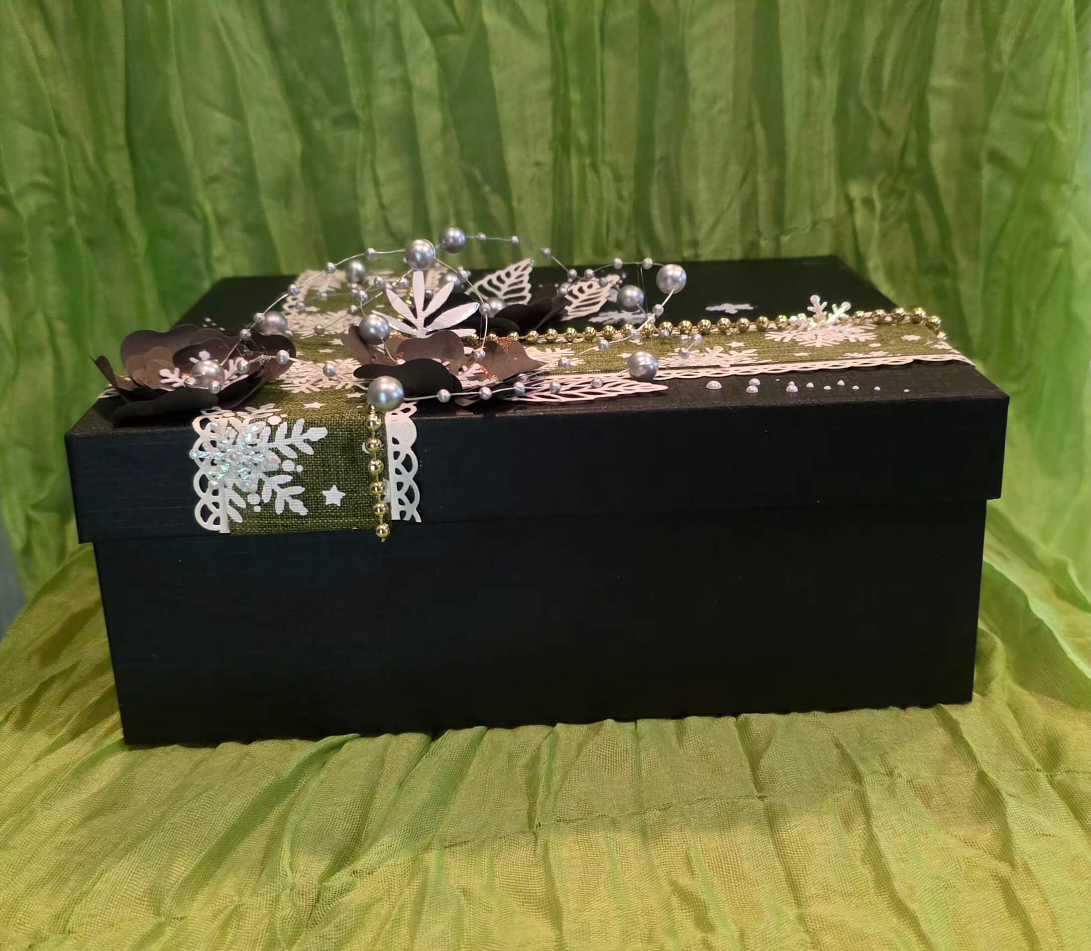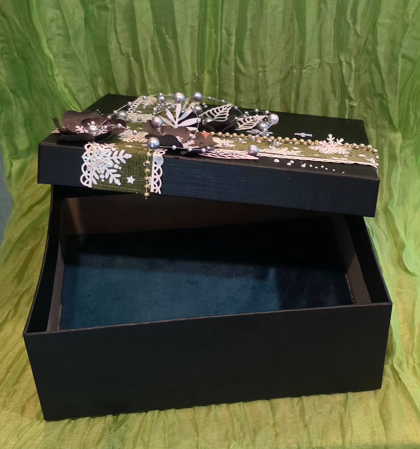 cardboard, velvet lining, linen printed pattern, paper, acrylic pearls, pearl chain