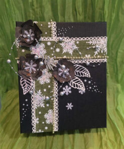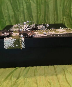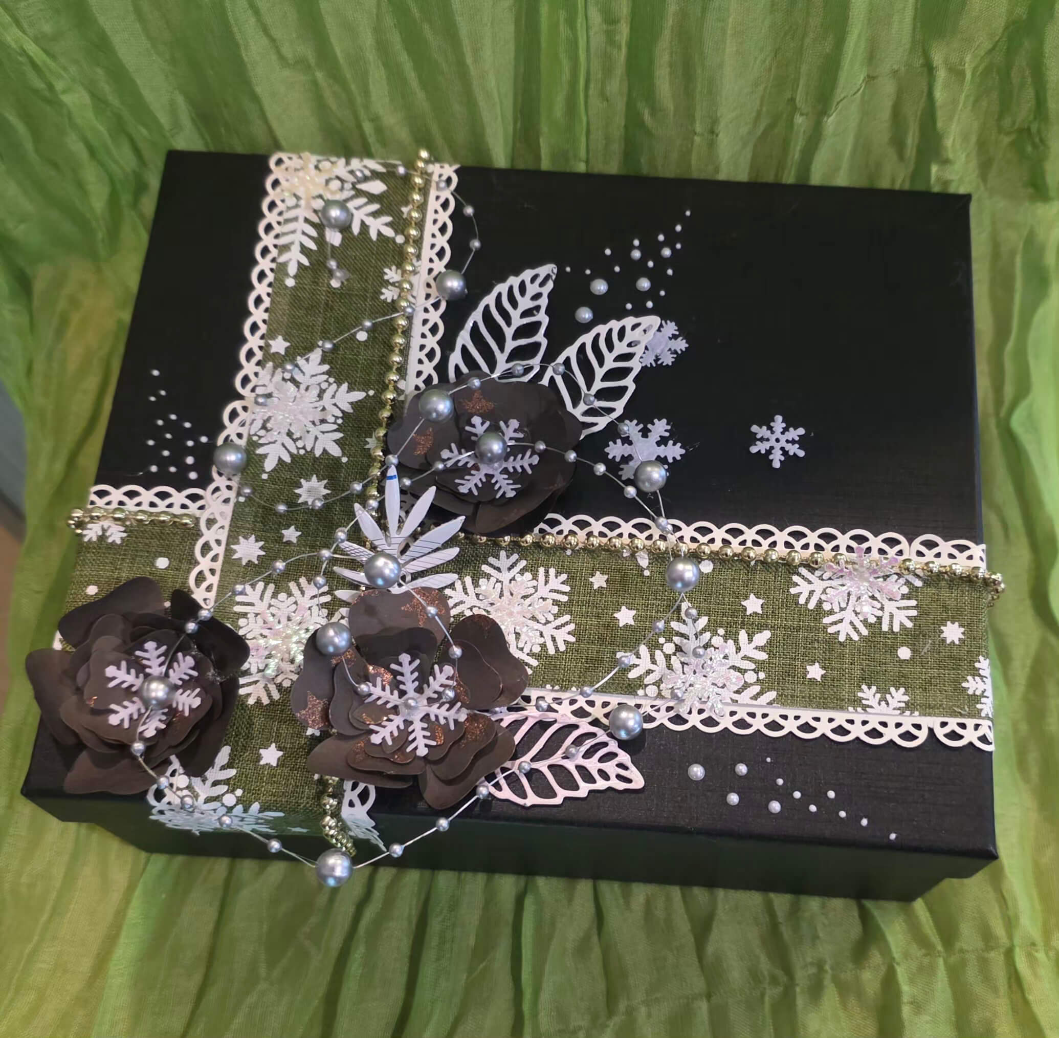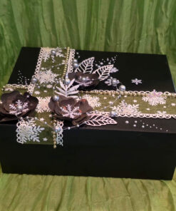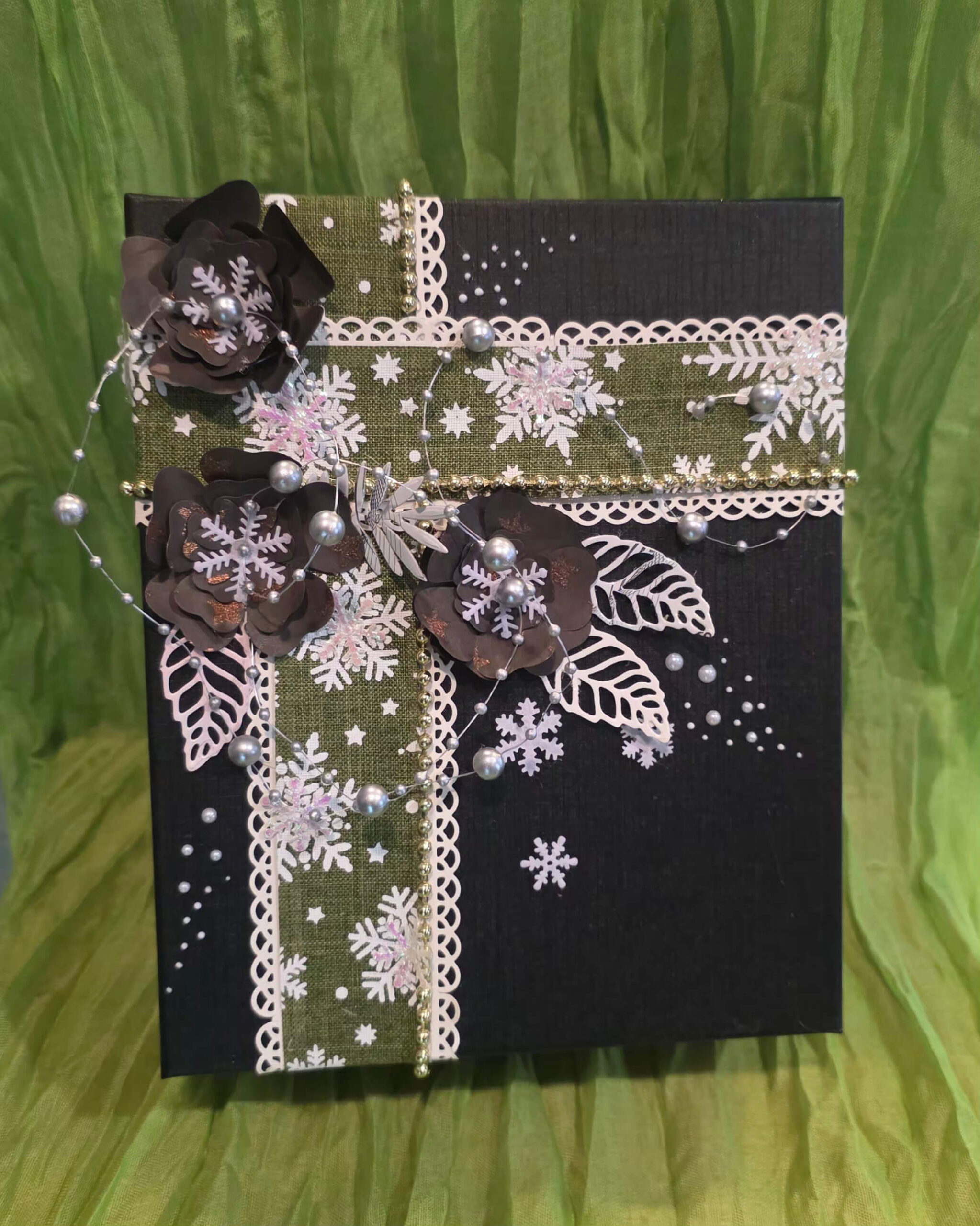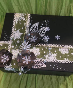 cardboard, velvet lining, linen printed pattern, paper, acrylic pearls, pearl chain