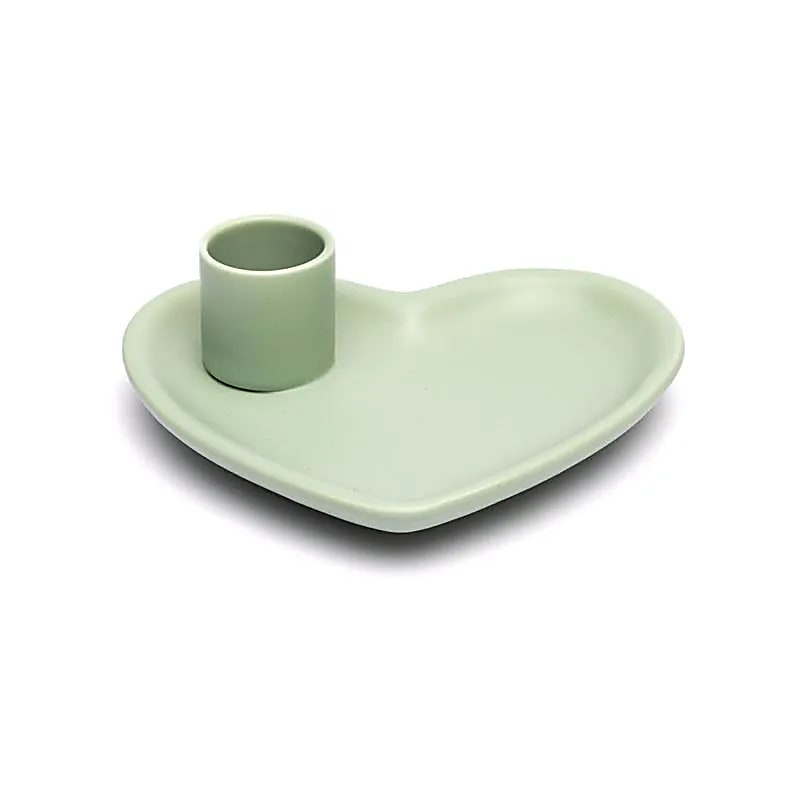 A heart-shaped ceramic smudging dish in soft pastel green with a built-in holder for Palo Santo sticks. The smooth, lightly matte surface gives it a refined, calm appearance. Designed for use in cleansing rituals or as a decorative piece in spiritual settings.