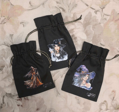 Natural cotton bag with satin drawstring, printed pattern.