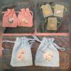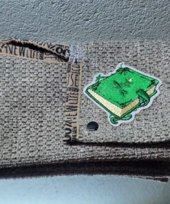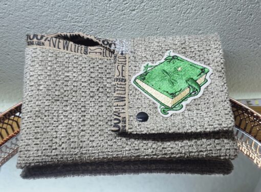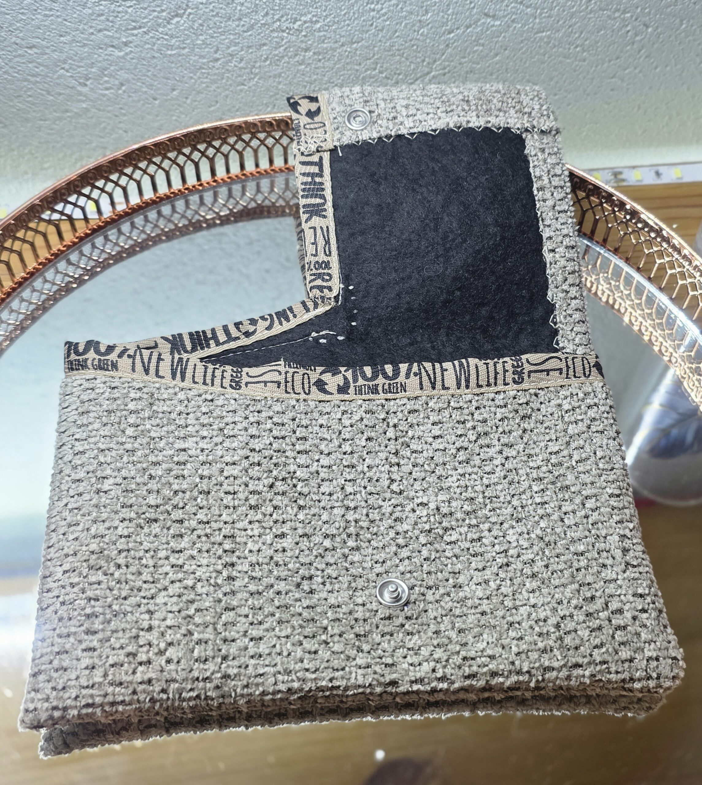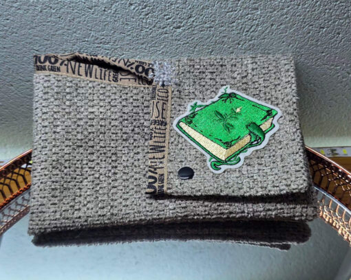 velvety textile, snap closure, embroidered pattern, ribbon made of 100% PET bottles
