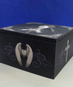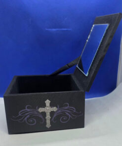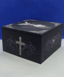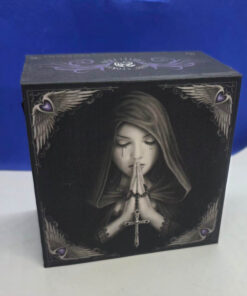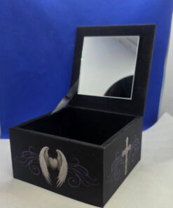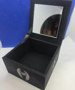 - 10cm × 10cm box made of compisite wood, covered in a printed material featuring Anne Stokes designs, and lined with a velvet effect material. Inside it has a 7cm × 7cm mirror attached to the lid.
