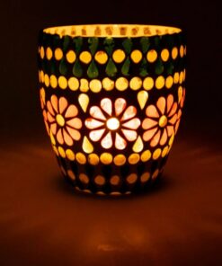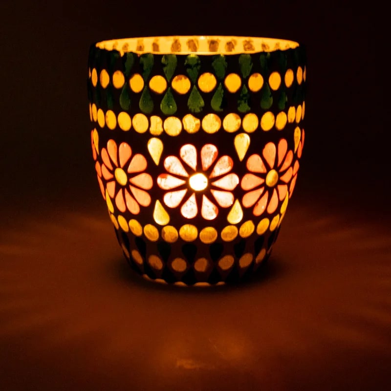 Colourful glass candle holder, suitable for t-lights and votive candles.