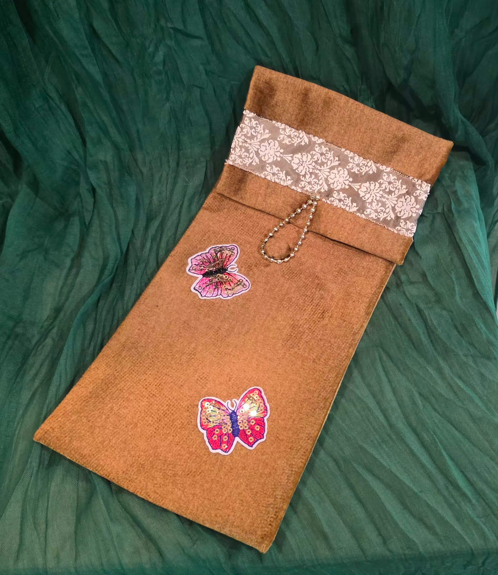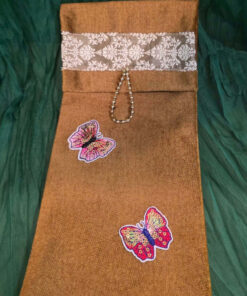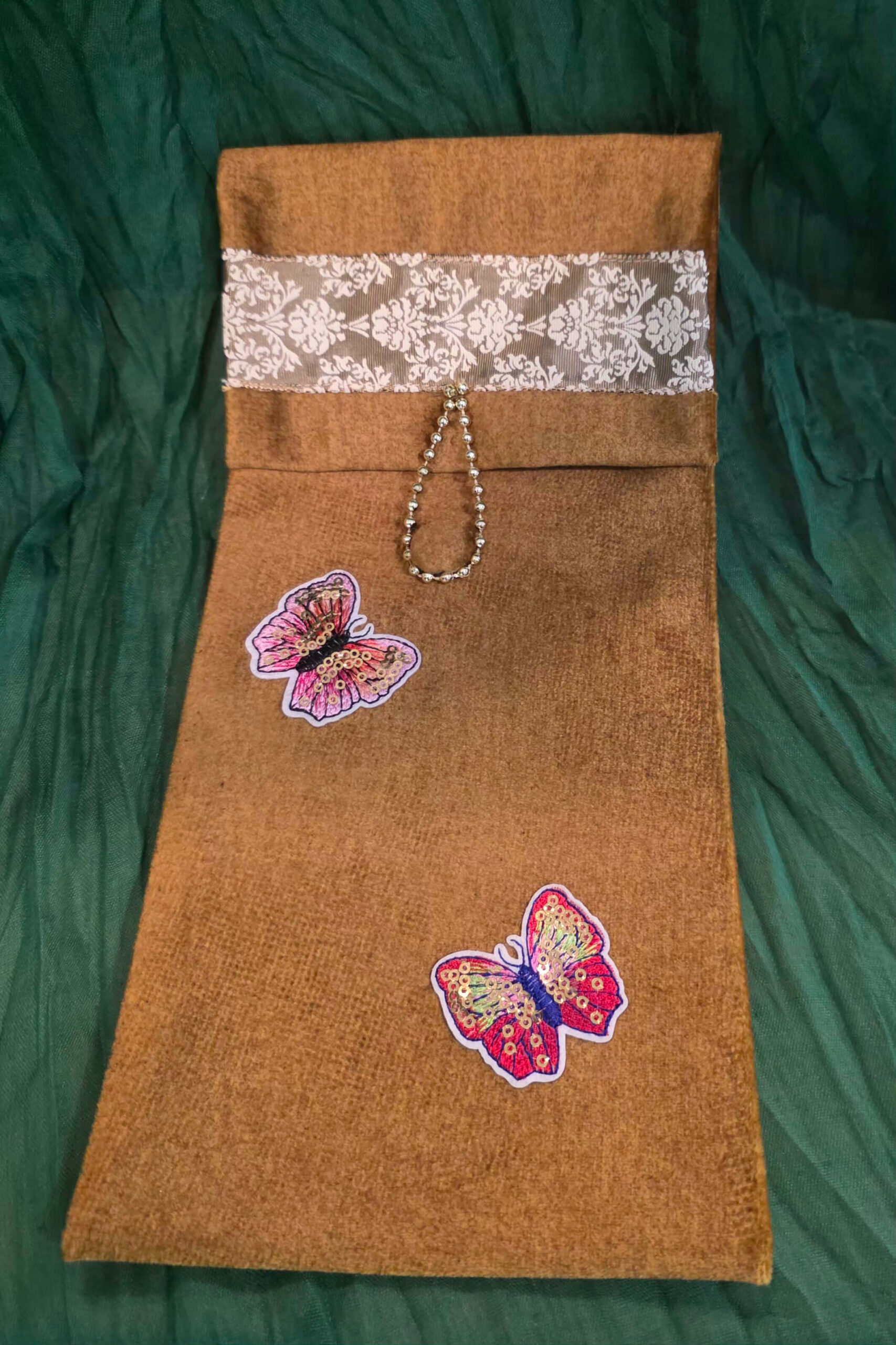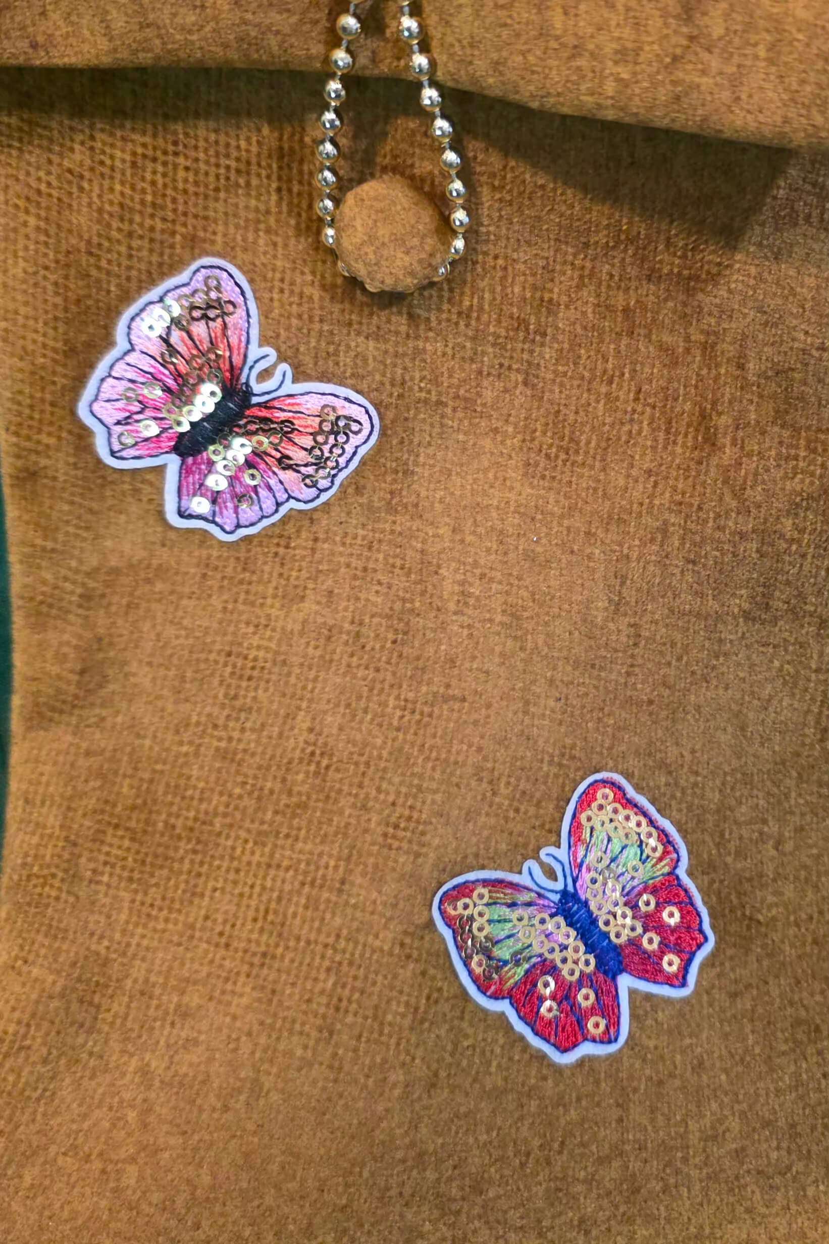 soft velvet, sequins butterflies embroidery, velvet button closure, printed pattern on polyester ribbon, beads chain