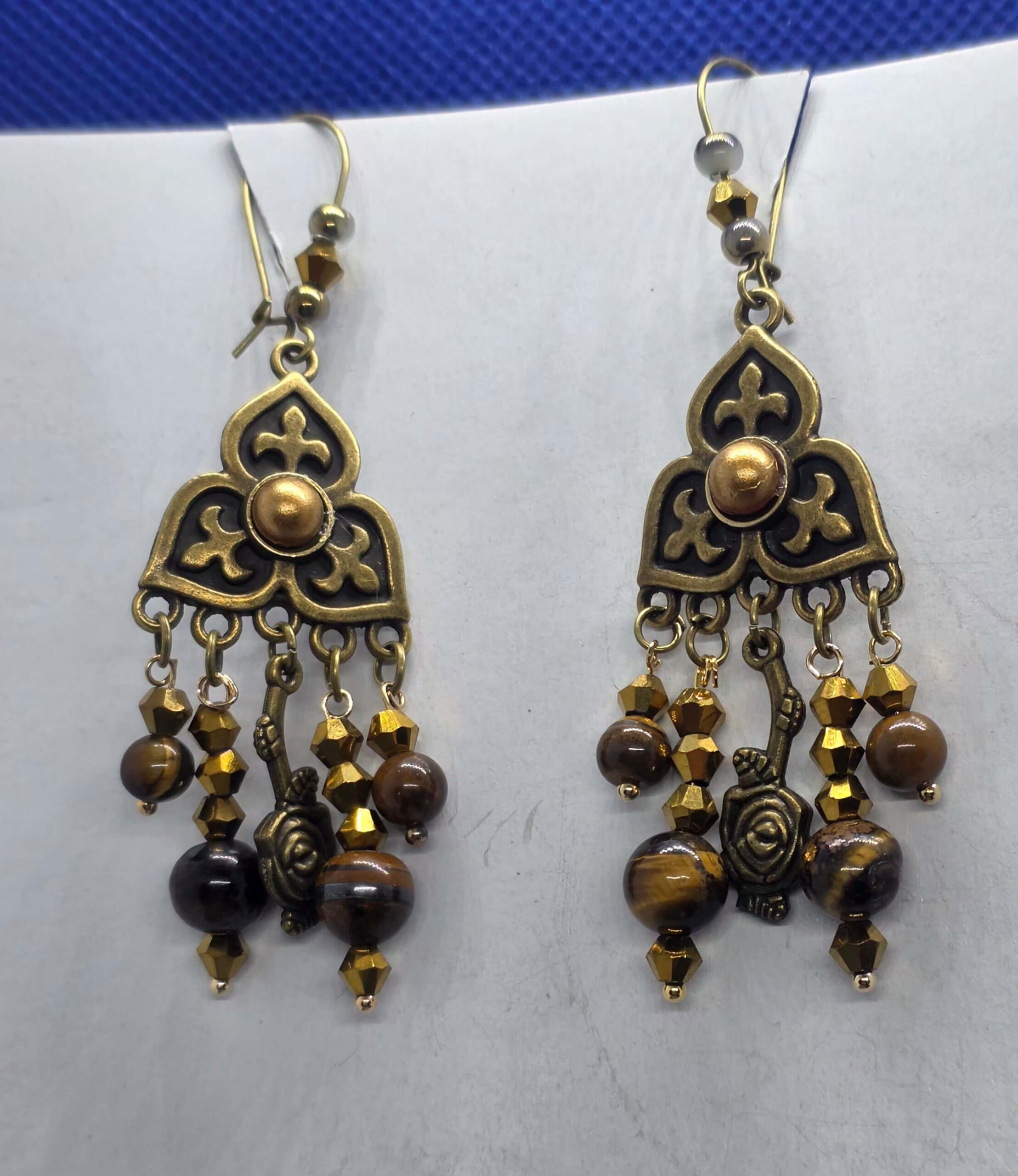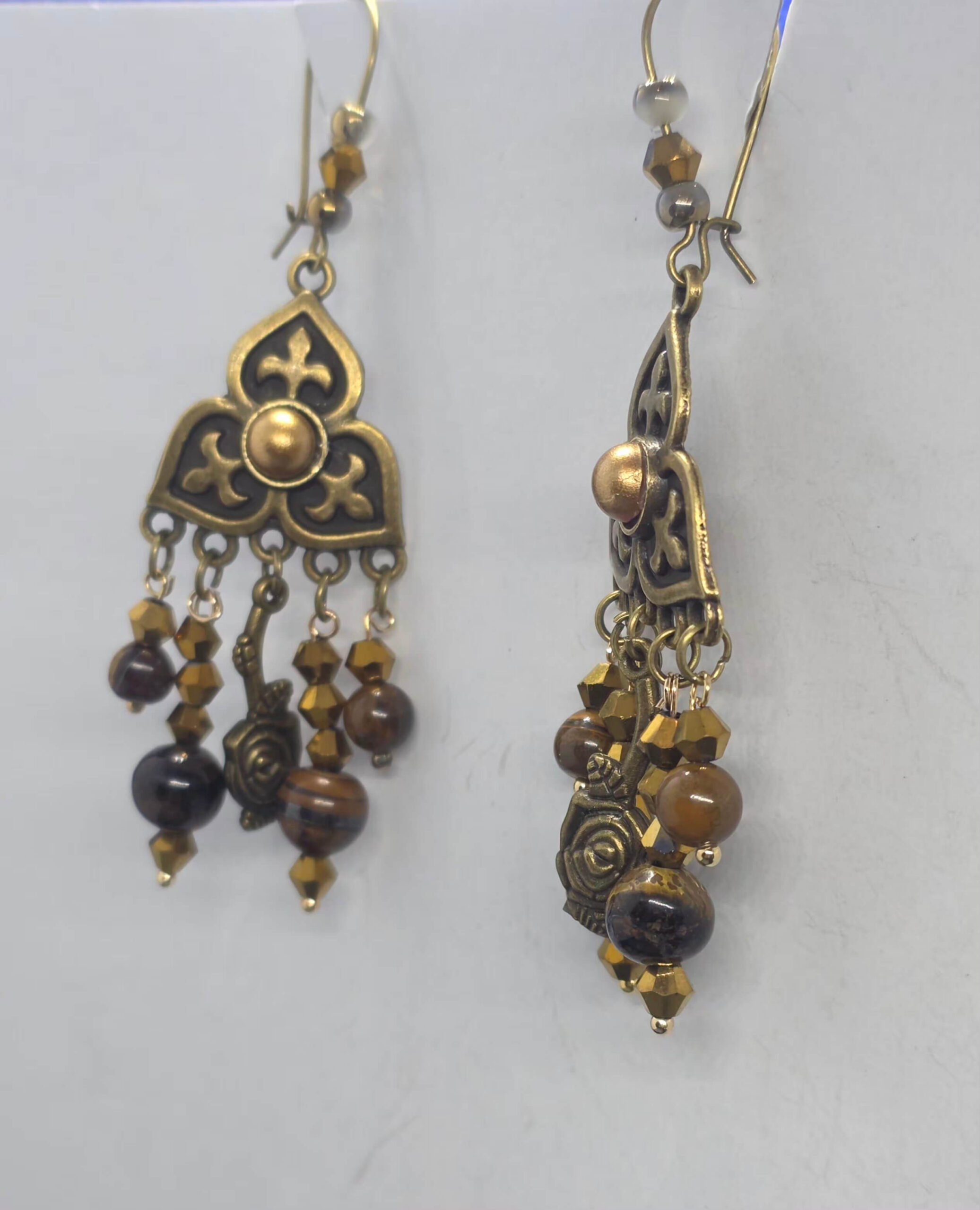 Tiger eye lily motif bronze long hook earrings