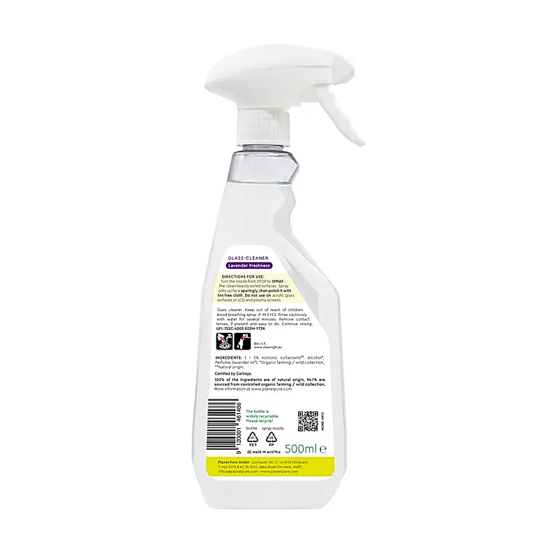 lavendli lõhn puhtast eeterlikust õlist. Palmiõli ja toornafta vaba. 100% koostisest on naturaalset päritolu. 94.1% pärit kontrollitud tootmisest või metsikust loodusest. Täiesti biolagunev. Pakend: pudel(rPET) valmistatud 100% ümbertöödeldud plastikust PET. Koos spray otsikuga (PP) ja silt (PE) valmistatud 56% ümbertöödeldud plastikust. Täiesti ümbertöödeldav. GMO ja säilitusainete vaba. Ei jäta järgi kahjulikke jääke pindadele ning tagab jälgedeta puhta pinna. Eco-garantii sertifikaat, Vegan