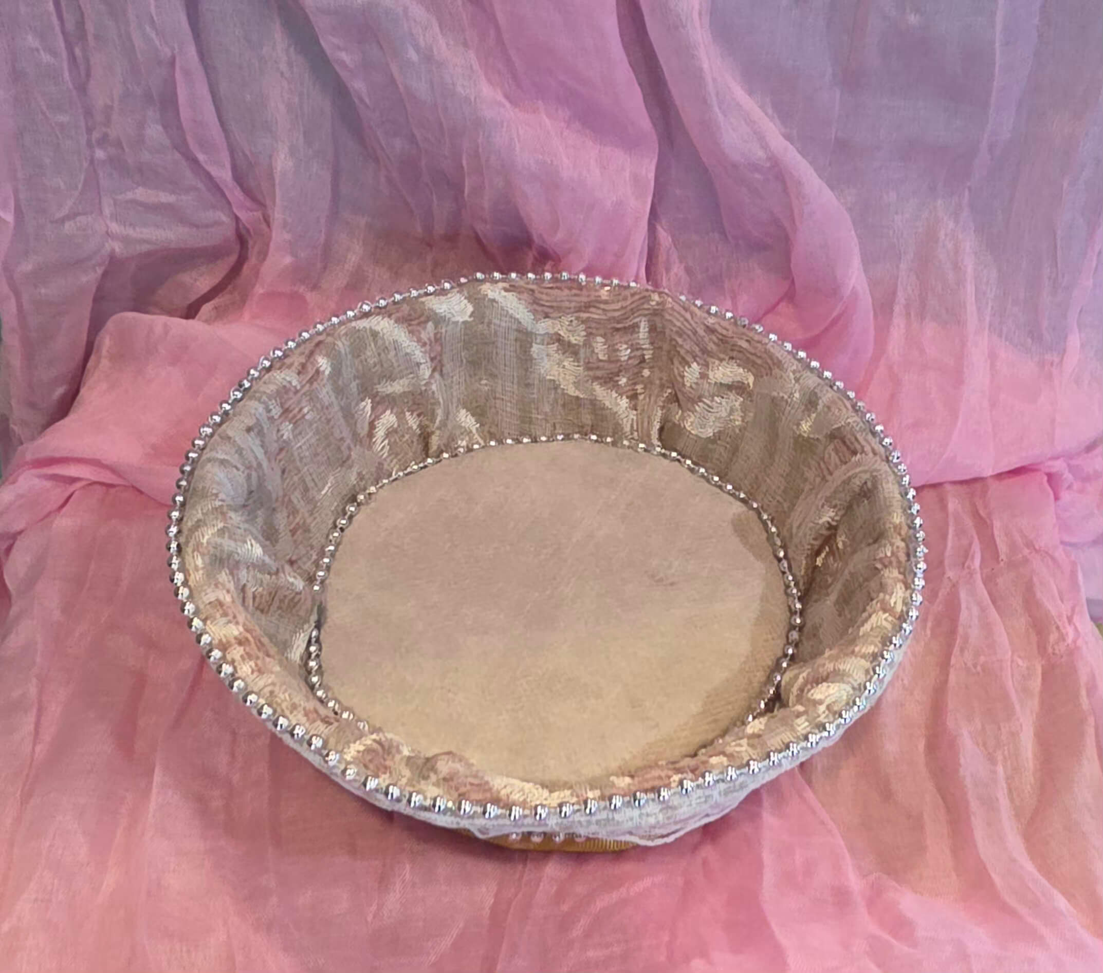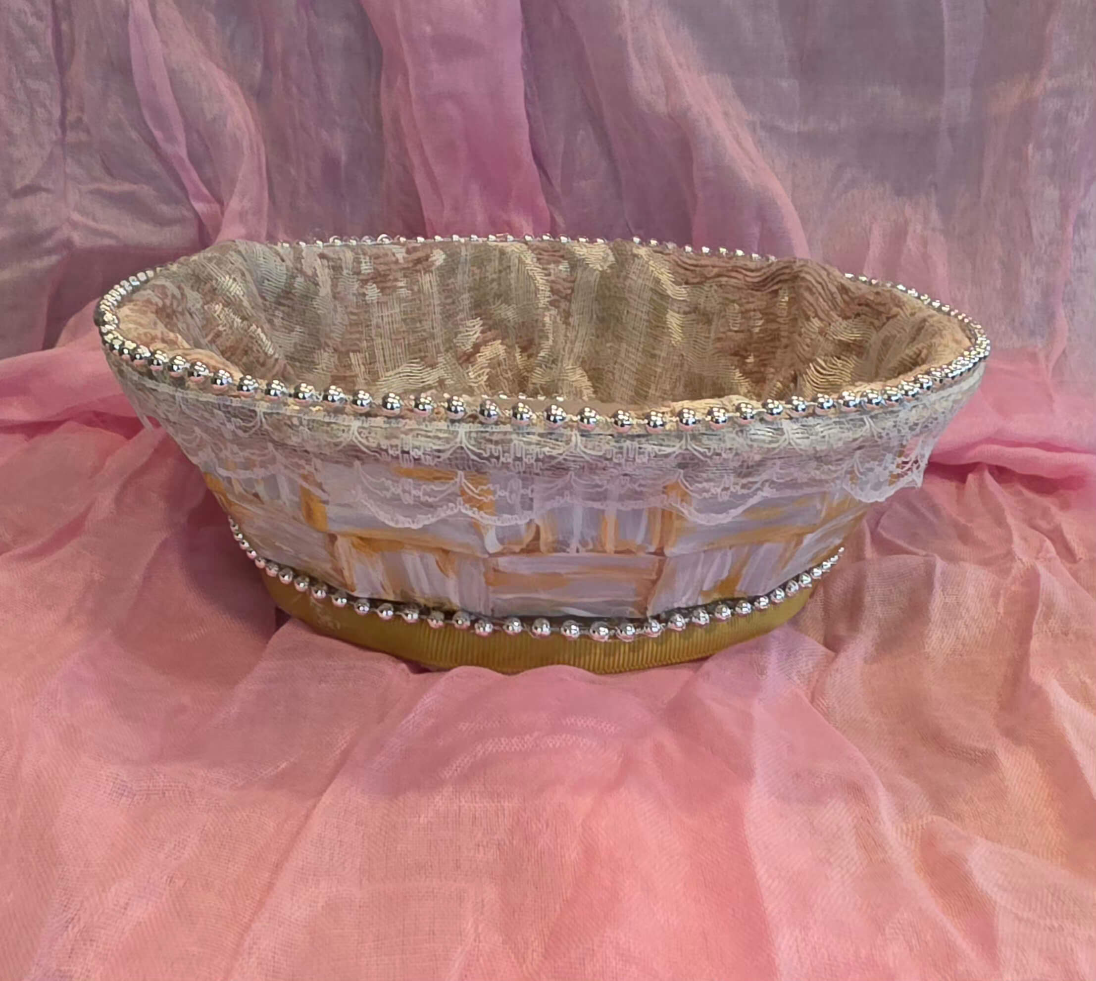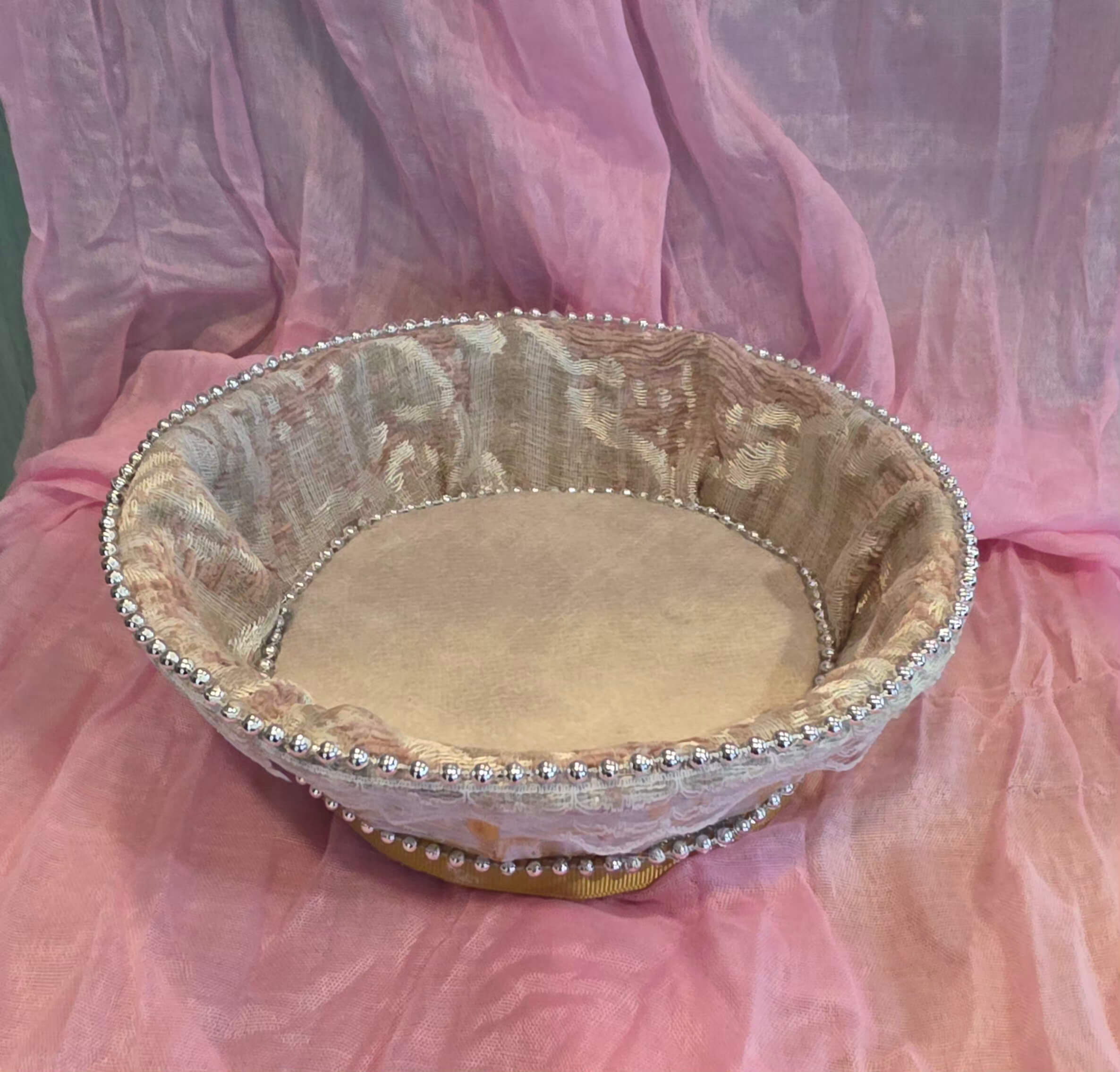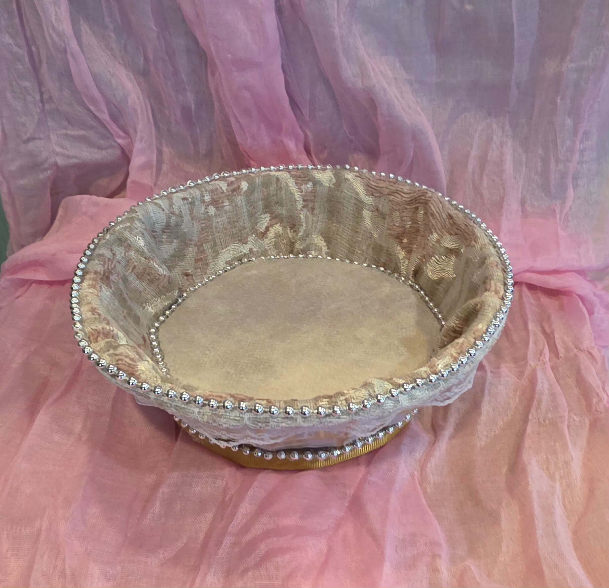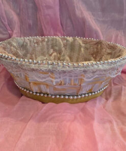 plastik vorm, samet kangast sisu, samet alus ja põhi, pits, polüester pael, pärlikett