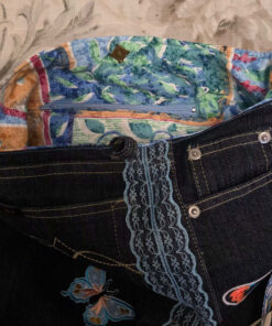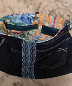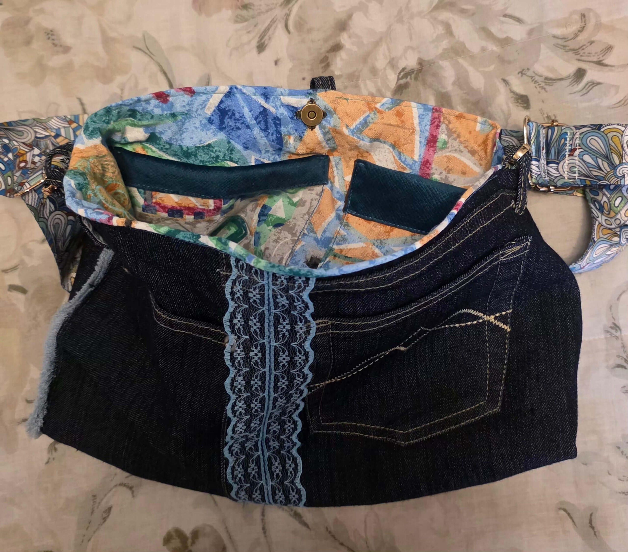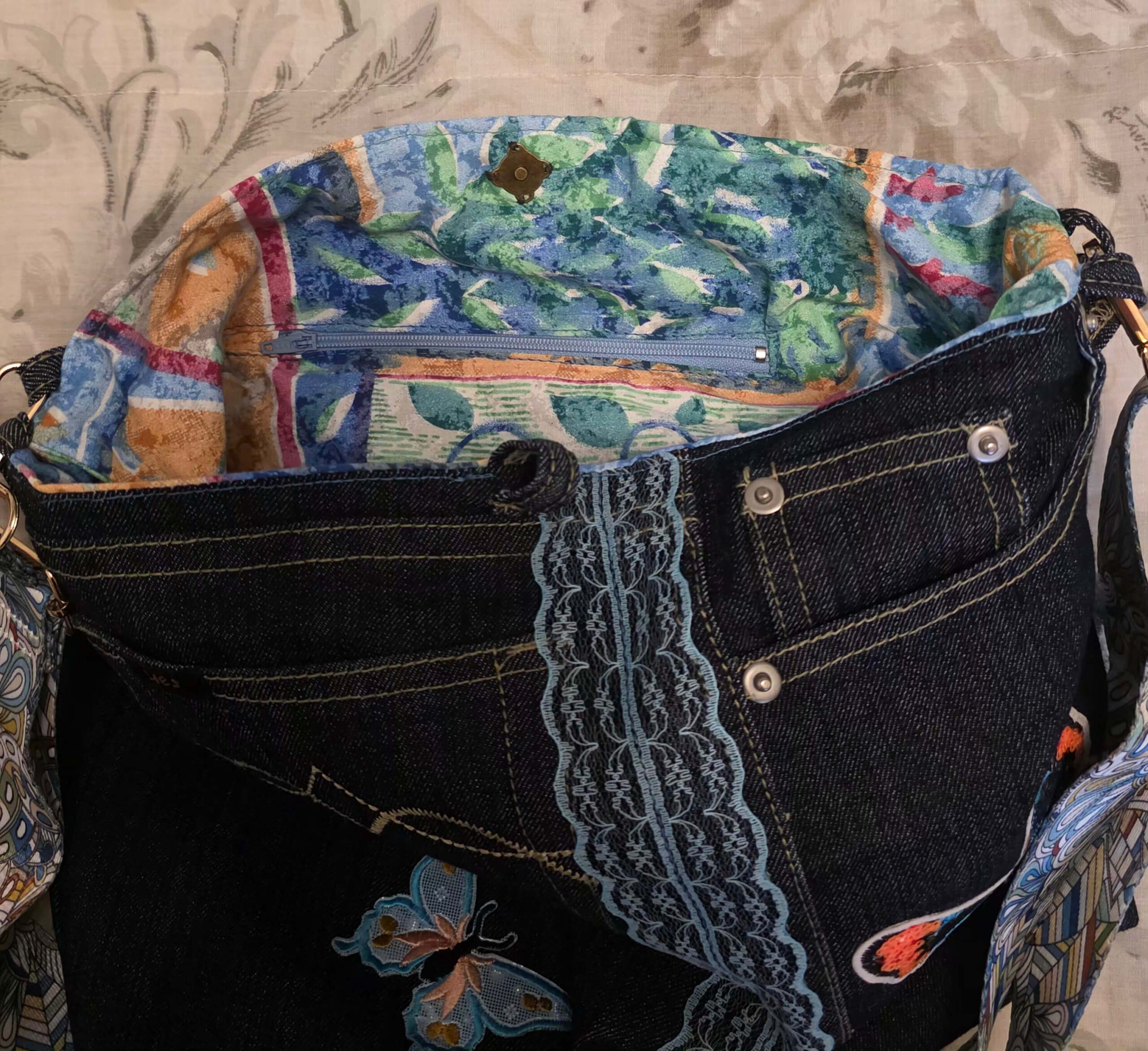 puuvillane mustriga vooder, palju samet äärega sisetaskuid ja tõmblukuga sisetasku, pits