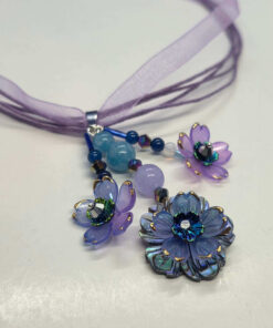 Paua merekarp akvamariin/jaad pärlitega lille ripatsiga organza paelaga kaelakee