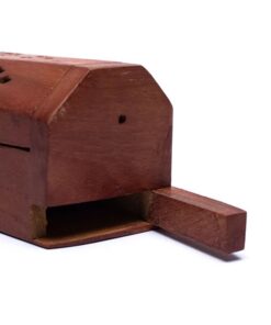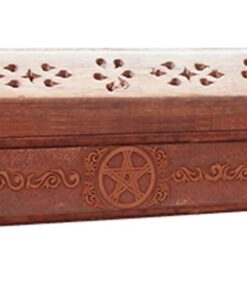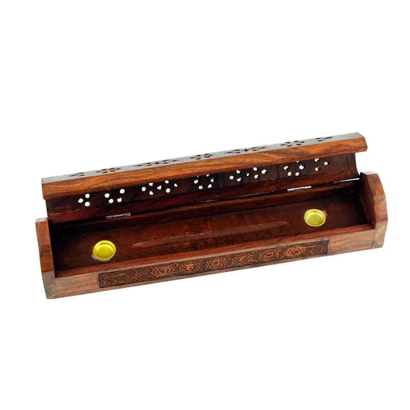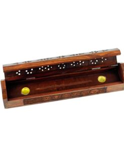 akaatsia puidust graveeritud mustriga karp viirukite ja lõhnakoonuste põletamiseks, all lahter viirukite hoidmiseks, sees metallist alused koonustele.