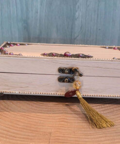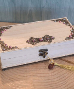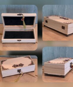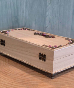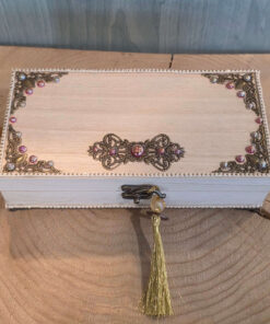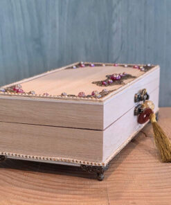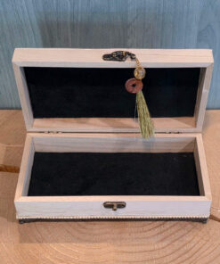 naturaalne puit, metall kaunistused, akrüül pärlid, sees tume roheline samet kangas, metall jalad, ripatsiks siid tutt helmestega ja Hiina õnnemündiga