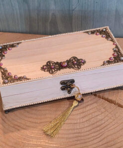 naturaalne puit, metall kaunistused, akrüül pärlid, sees tume roheline samet kangas, metall jalad, ripatsiks siid tutt helmestega ja Hiina õnnemündiga