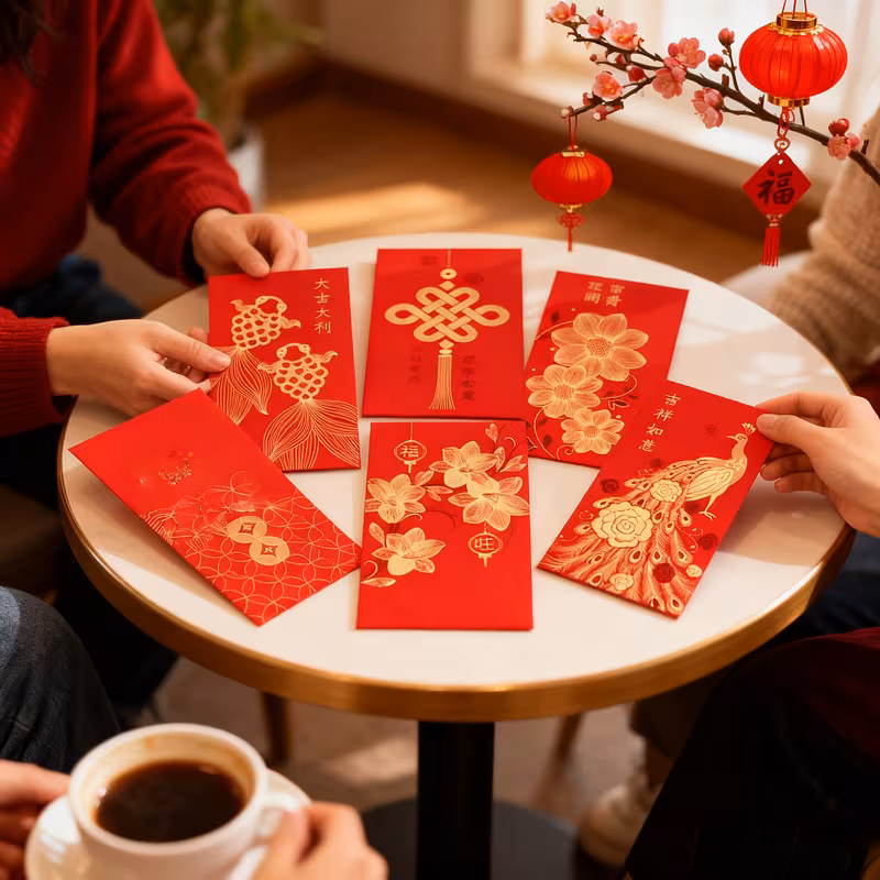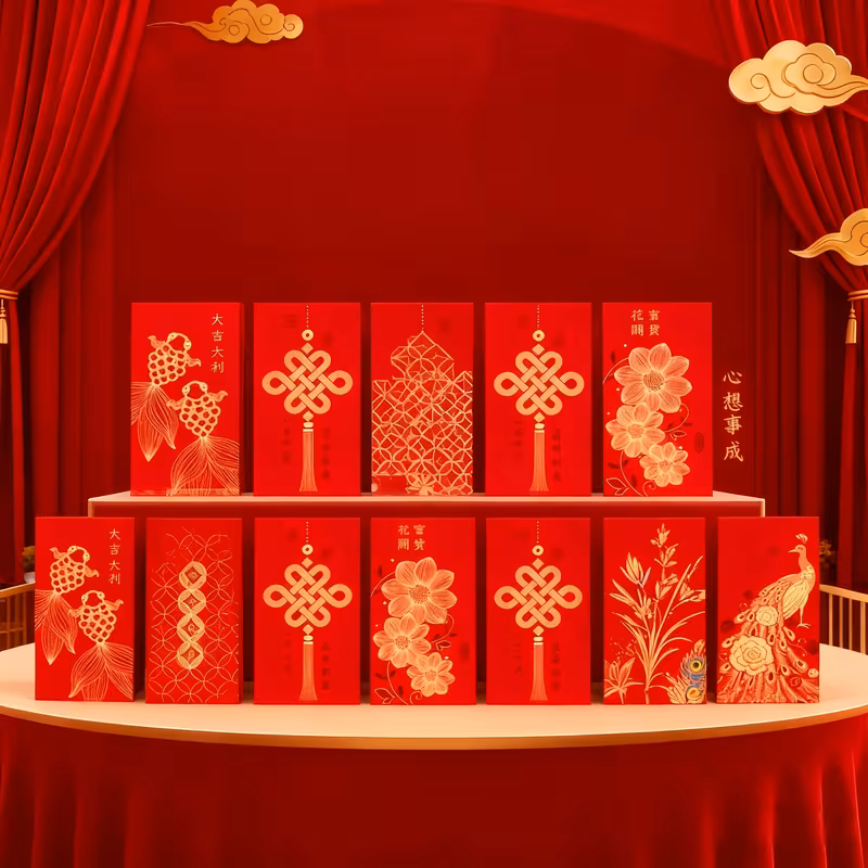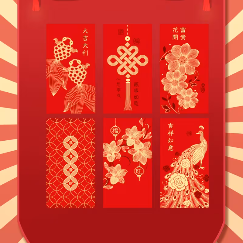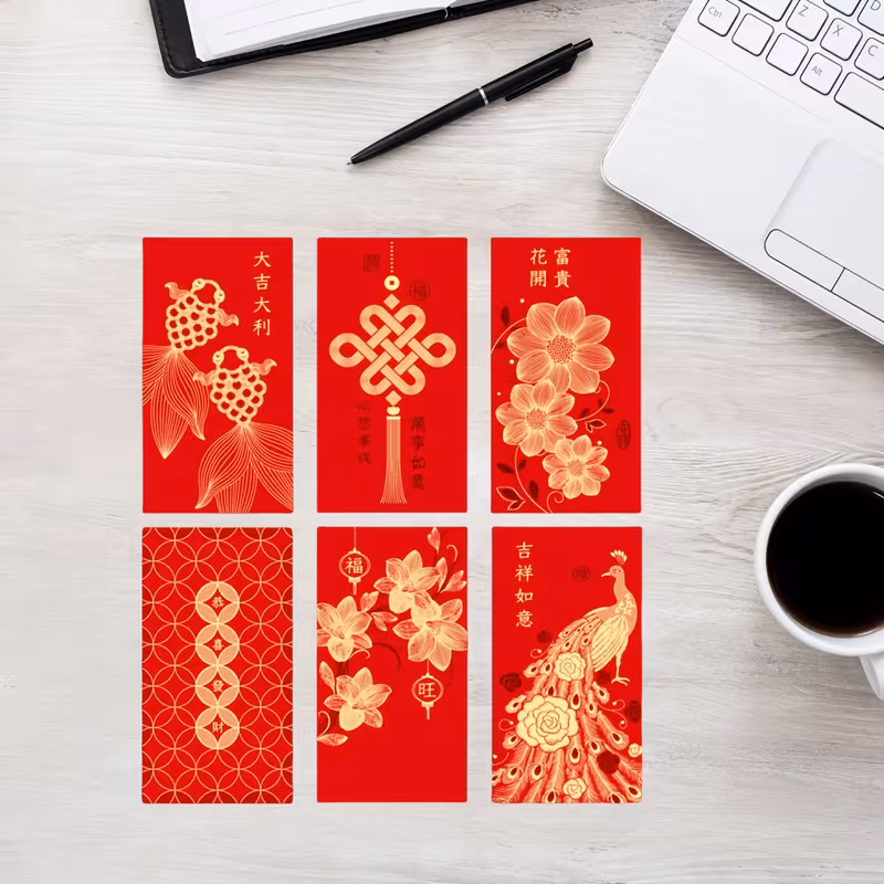 Punane Hiina õnneümbrik kuldse mustriga