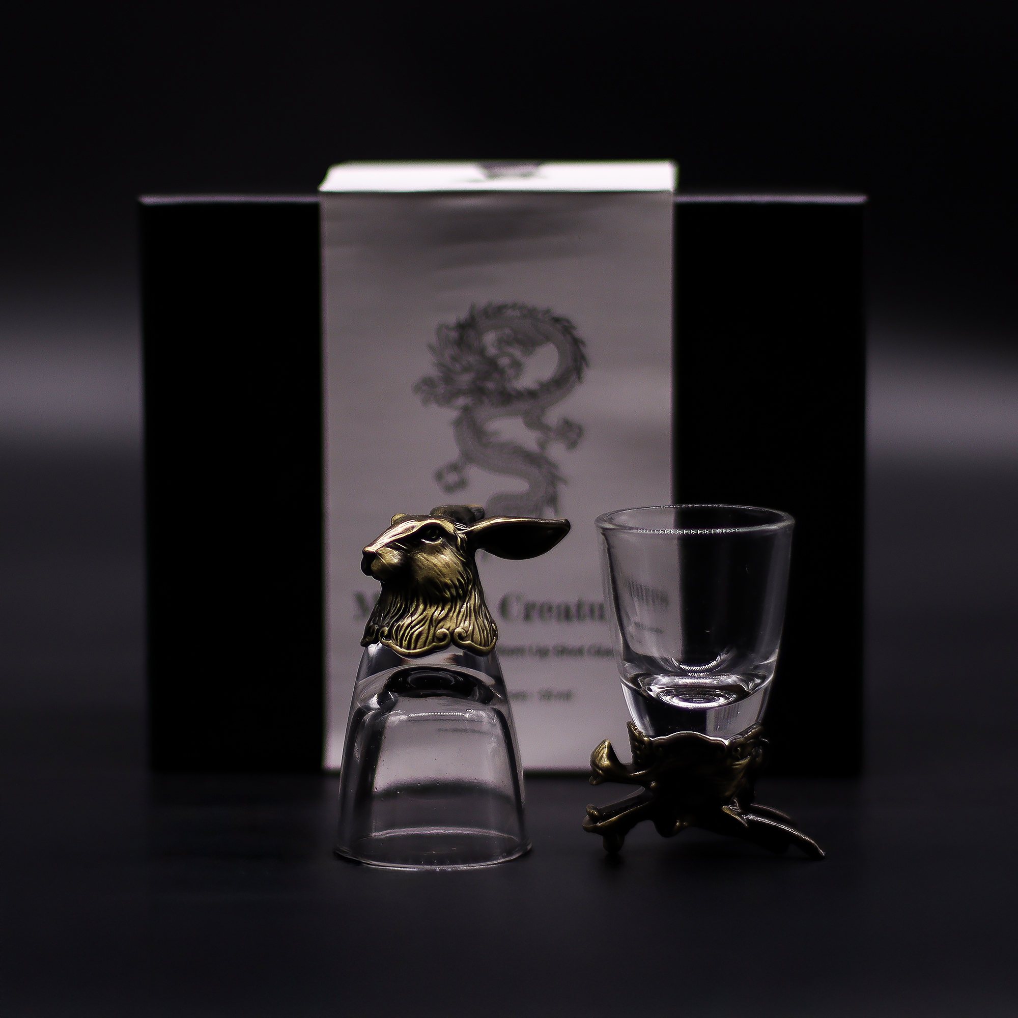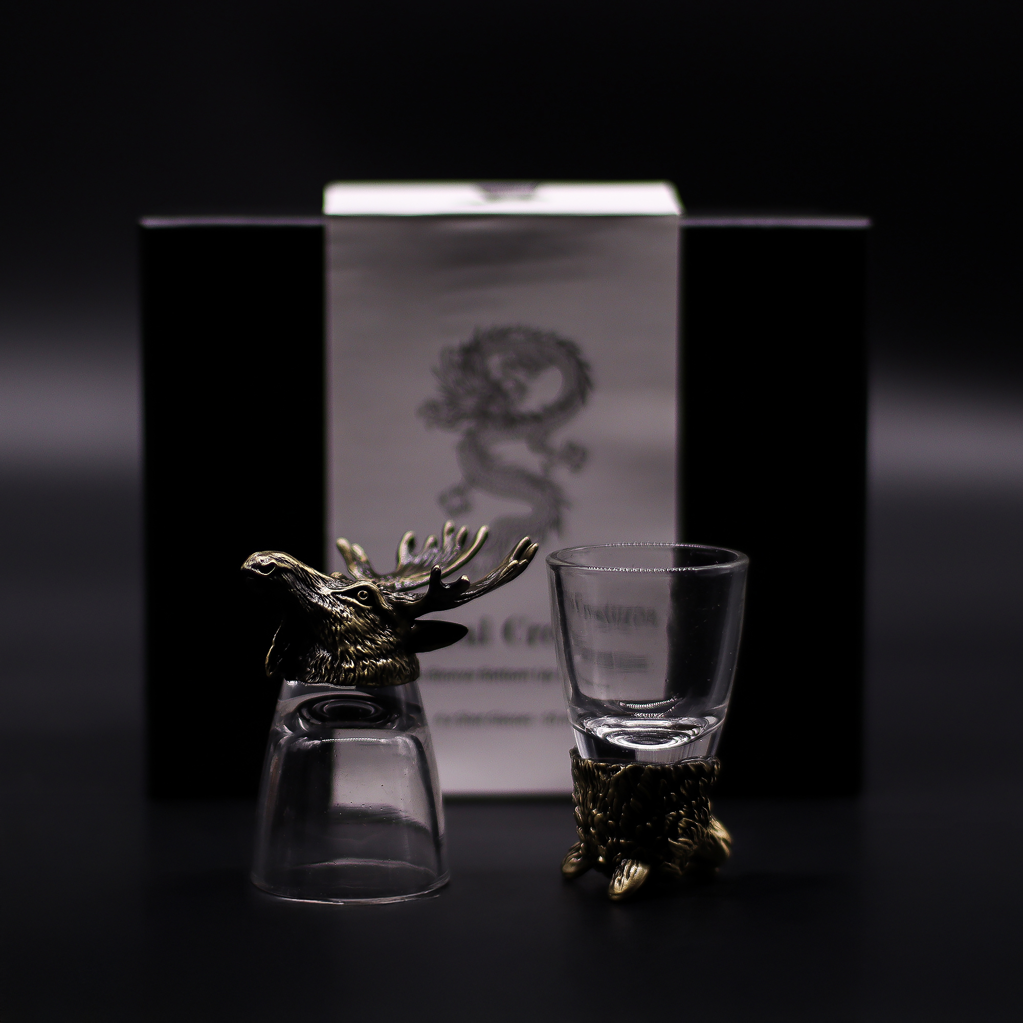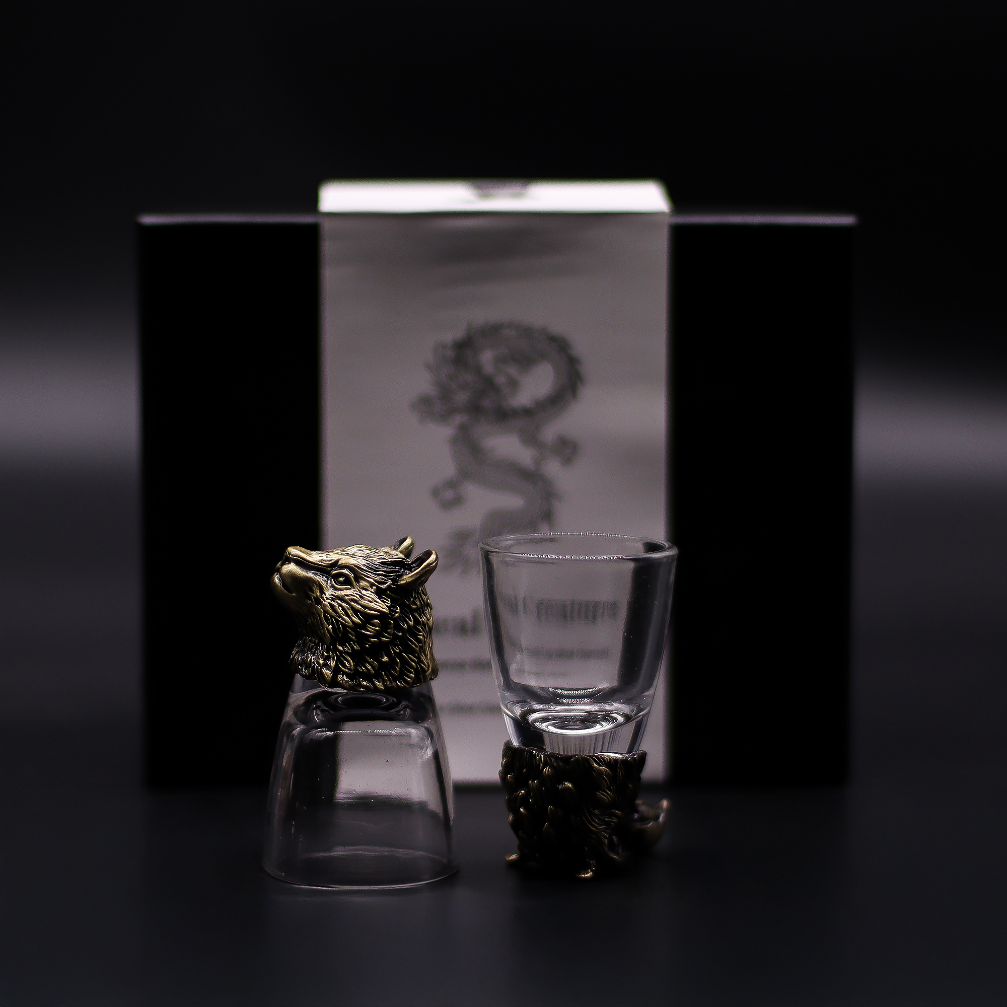 50 ml klaas on käsitsi valmistatud selgest klaasist messingist jalaga, detailselt viimistletud looma kujuliseks. Asetades kuju ülespoole loob see dekoratiivse kuju konnast kuni hirve, karu, draakoni või pullini, kus detailid, nagu kõrvad, sarved, tiivad jne. on viimistletud täiuslikult tasakaalu, kui kaas asetada lauale. Klaas sobib fantaasia armastajale. Suurepärane ka kollektsionääridele.
